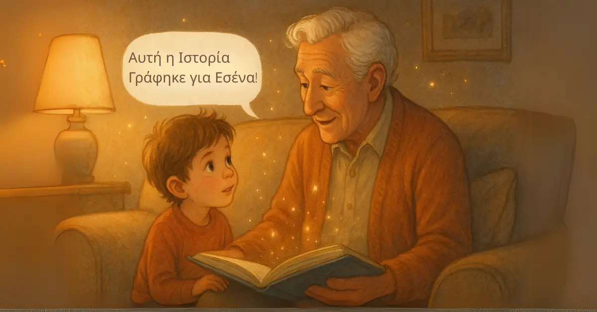 “Αυτό το παραμύθι είναι γραμμένο για σένα”; Δεν κοιτάει απλώς το βιβλίο. Σε κοιτάει. Γιατί καταλαβαίνει ότι εκείνη τη στιγμή, το παραμύθι είναι η αφορμή για να έρθεις κοντά του.